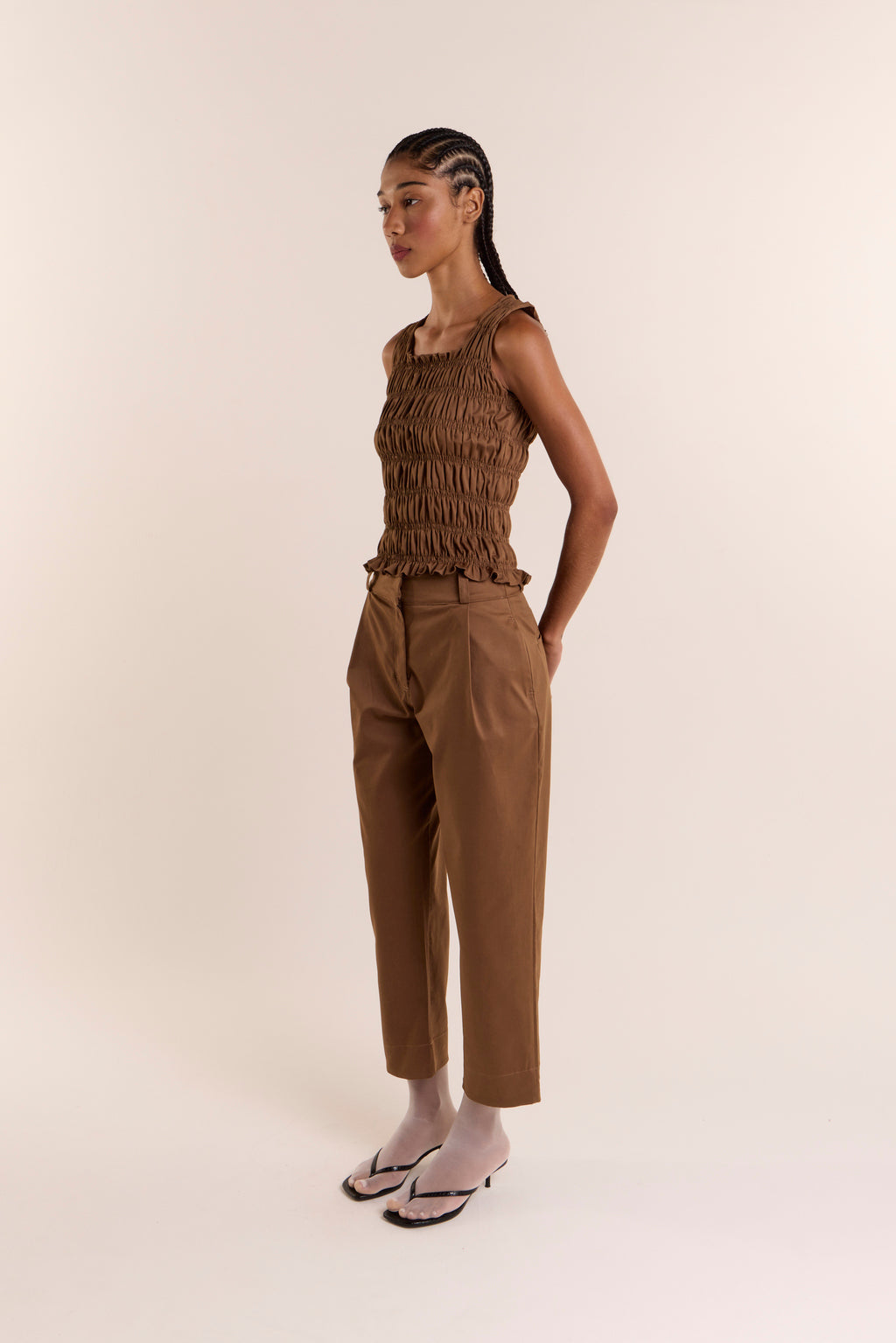Confeccionada em sarja de algodão, a peça tem estrutura suave, toque macio e elasticidade na medida certa — ideal para o dia a dia, trabalho ou ocasiões casuais chic.