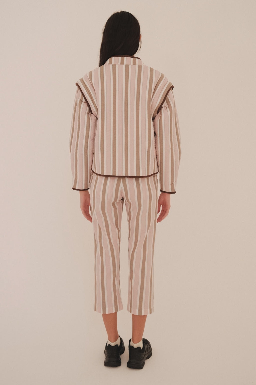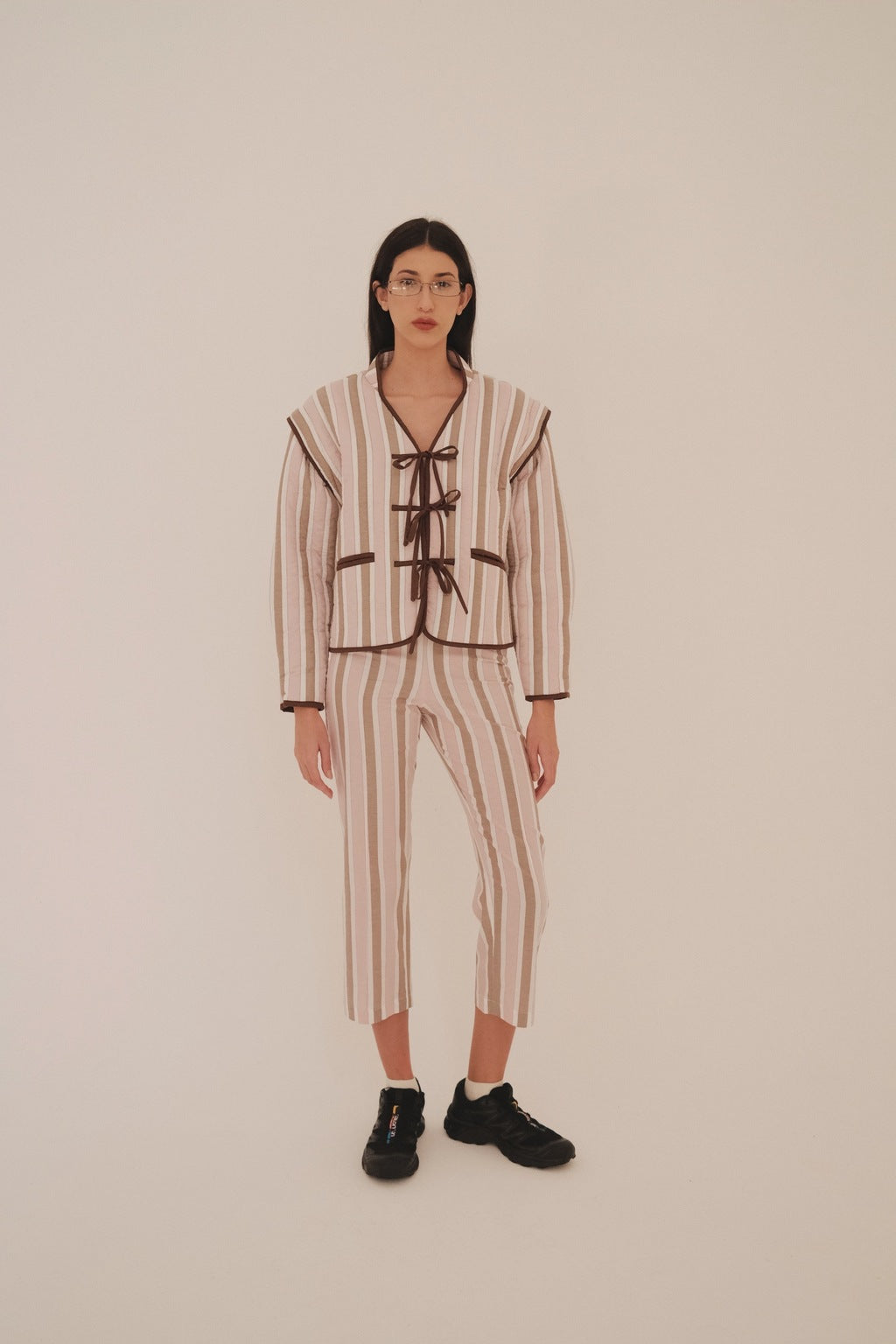 O matelassê feito à mão adiciona valor artístico e exclusividade, enquanto o forro e o viés revestindo toda a peça garantem acabamento impecável. A manga traz prega fêmea, criando um volume arquitetônico delicado. Os bolsos frontais e o fechamento por amarração reforçam a estética minimalista e funcional da peça.