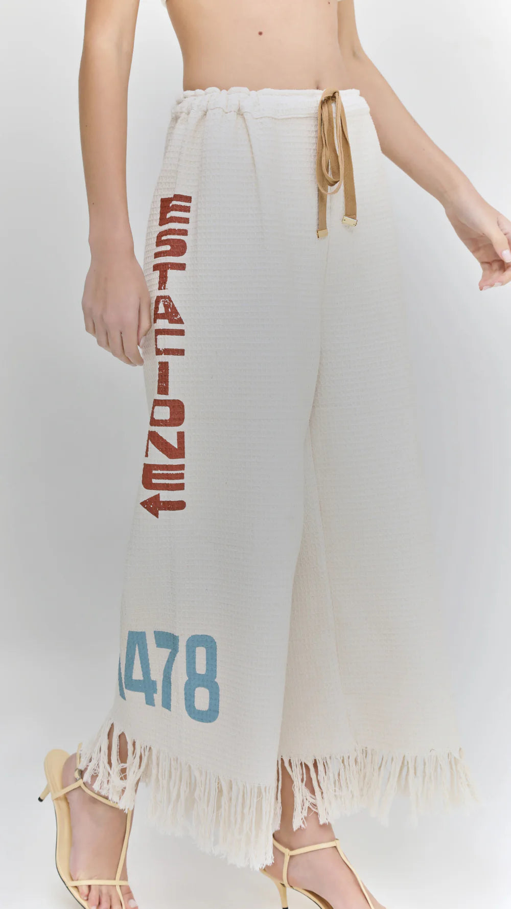 calça estacionamento, da marina bitu, é — confeccionada em algodão de textura rústica, com estampa exclusiva impressa em serigrafia a partir da pesquisa visual da artista cearense paula siebra sobre o centro de fortaleza. a modelagem ampla em comprimento longuete é ajustada na cintura por cadarço de algodão com ponteiras de metal dourado, equilibrando funcionalidade e detalhe artesanal.
