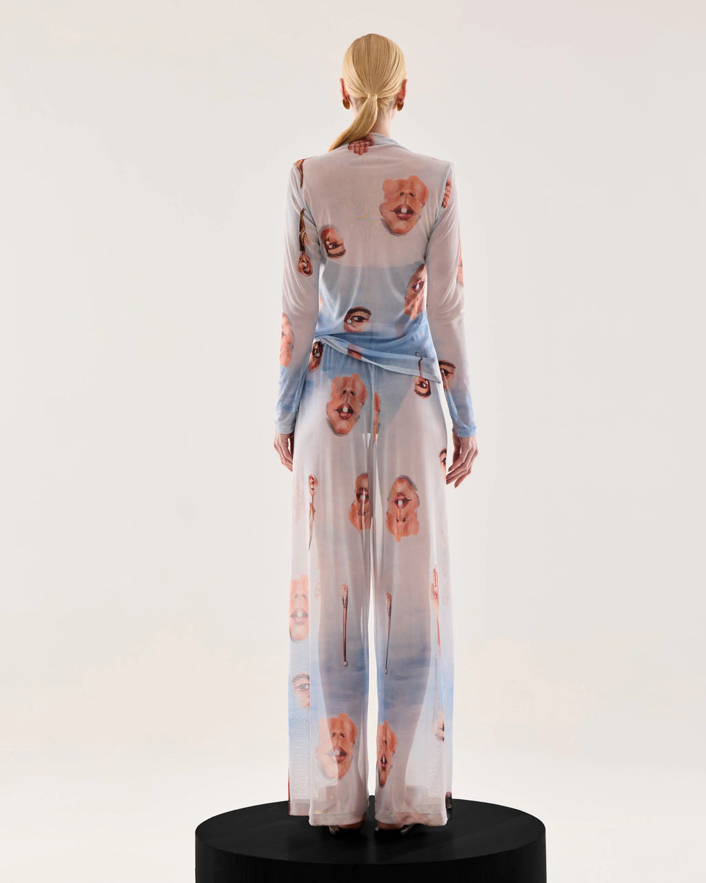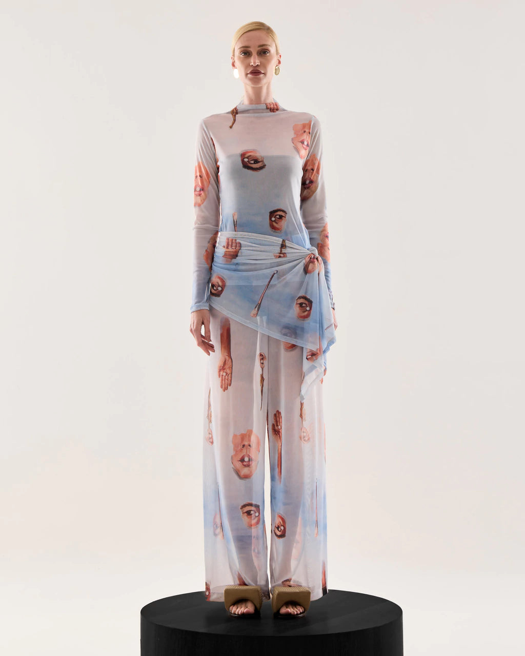 calça tule traços, da sau, é confeccionada em tule estampado com mistura de poliéster e elastano, que garante elasticidade e leveza ao caimento. de modelagem ampla com cós de elástico, proporciona conforto e movimento fluido, funcionando bem tanto sozinha quanto em sobreposição a bodies e hotpants para explorar a transparência do tecido.