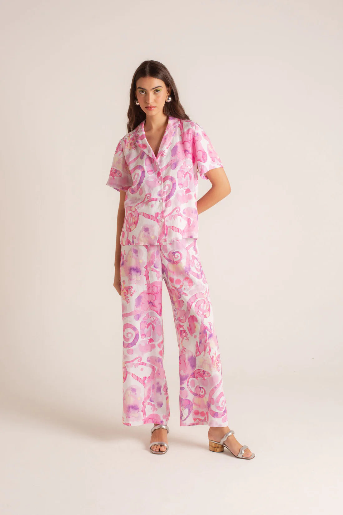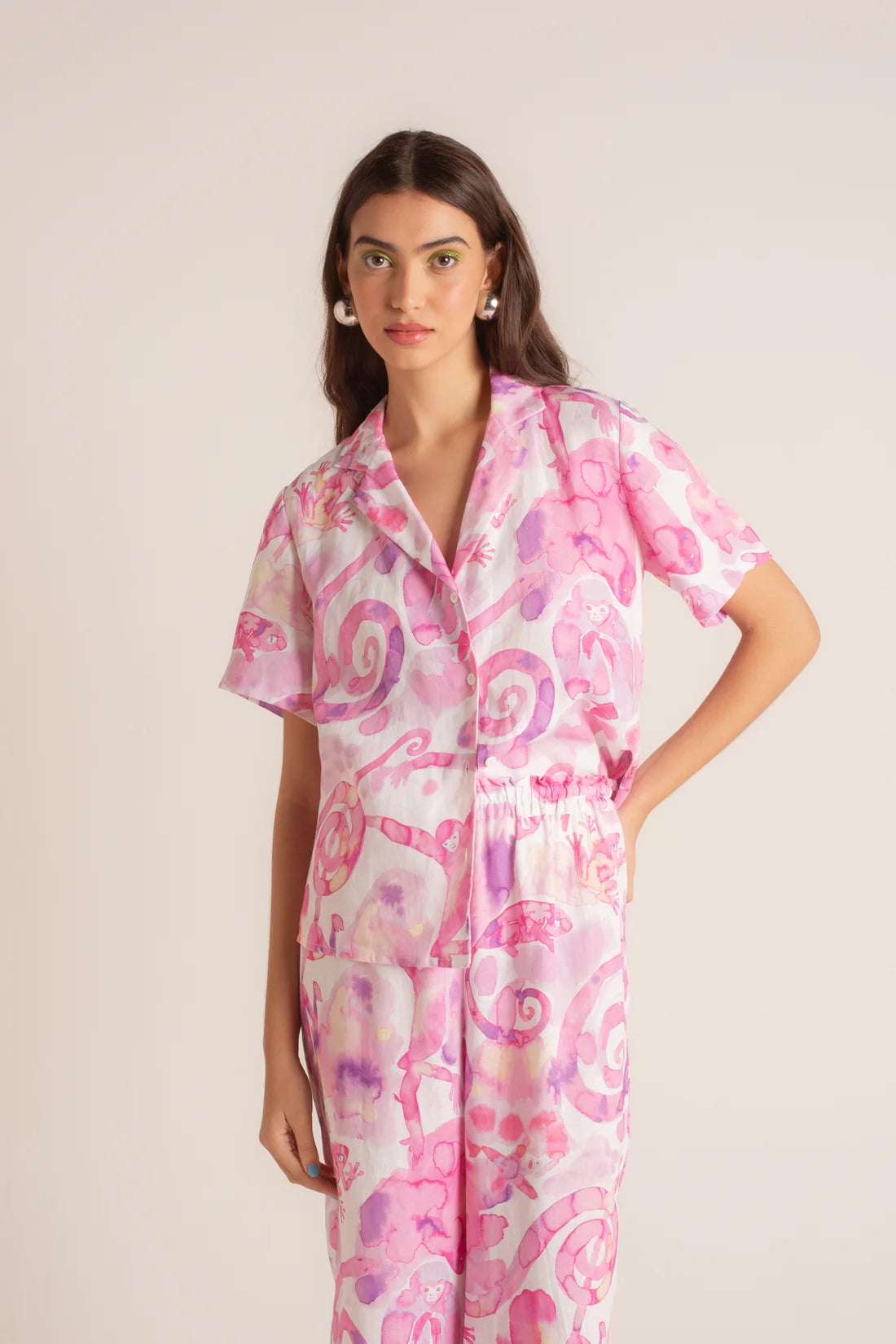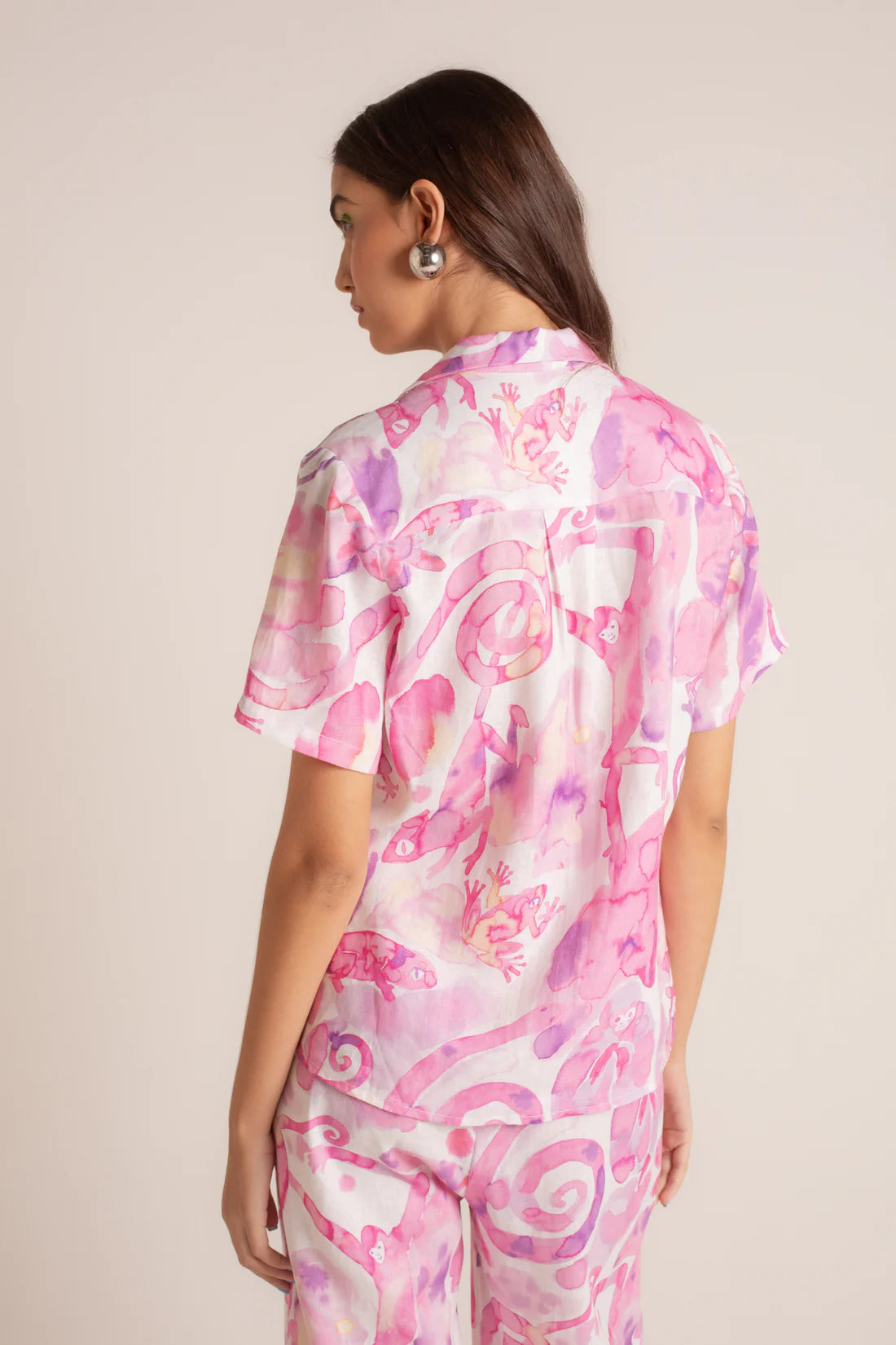 Camisa de manga curta com gola estilo blazer e decote em V.