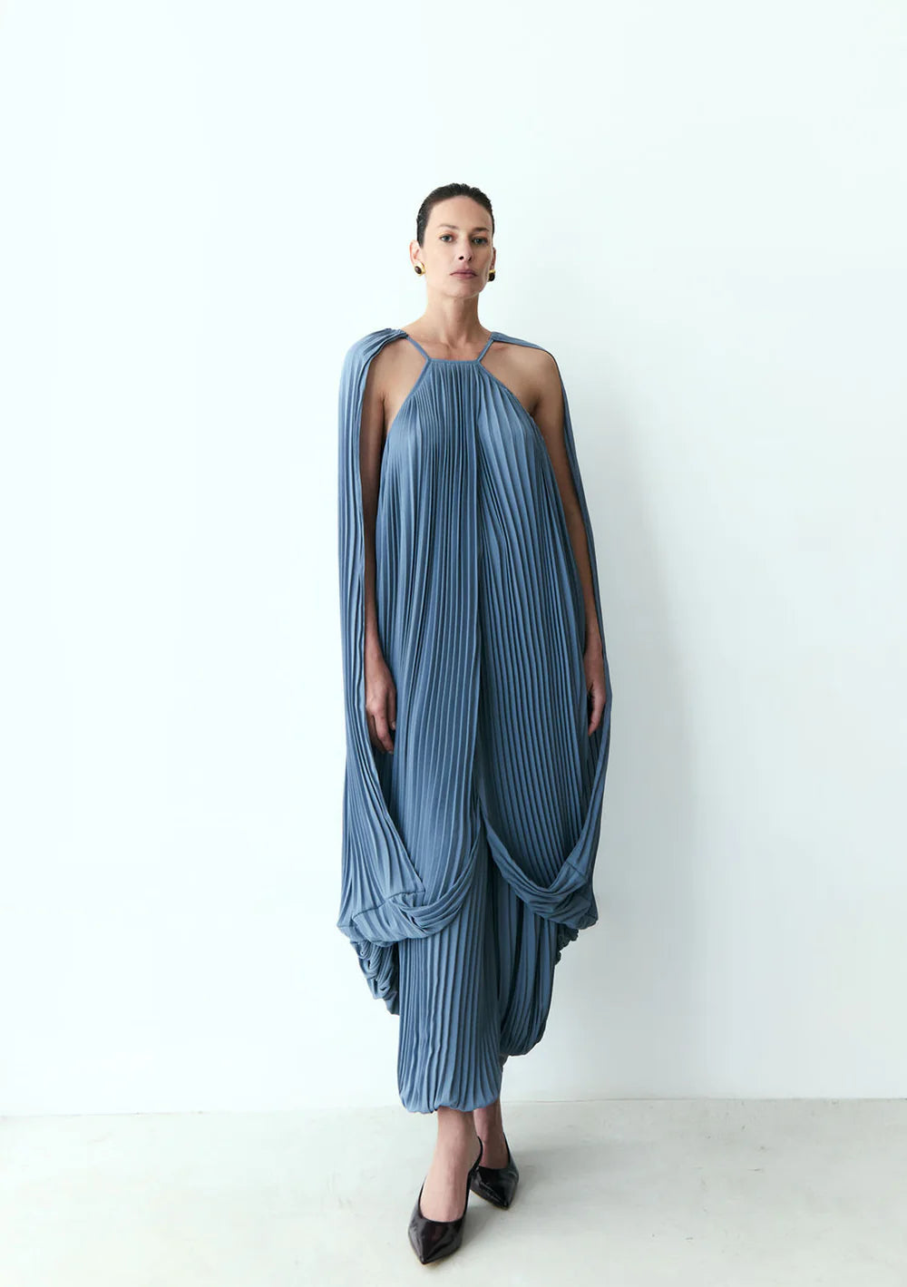 calça pleats azul, da marina bitu, é — confeccionada em poliéster plissado, com modelagem ampla e cintura alta que alonga a silhueta. o detalhe da perna balonê é estruturado pelo acabamento em elástico no cós e nos tornozelos, criando um efeito volumoso e escultural.