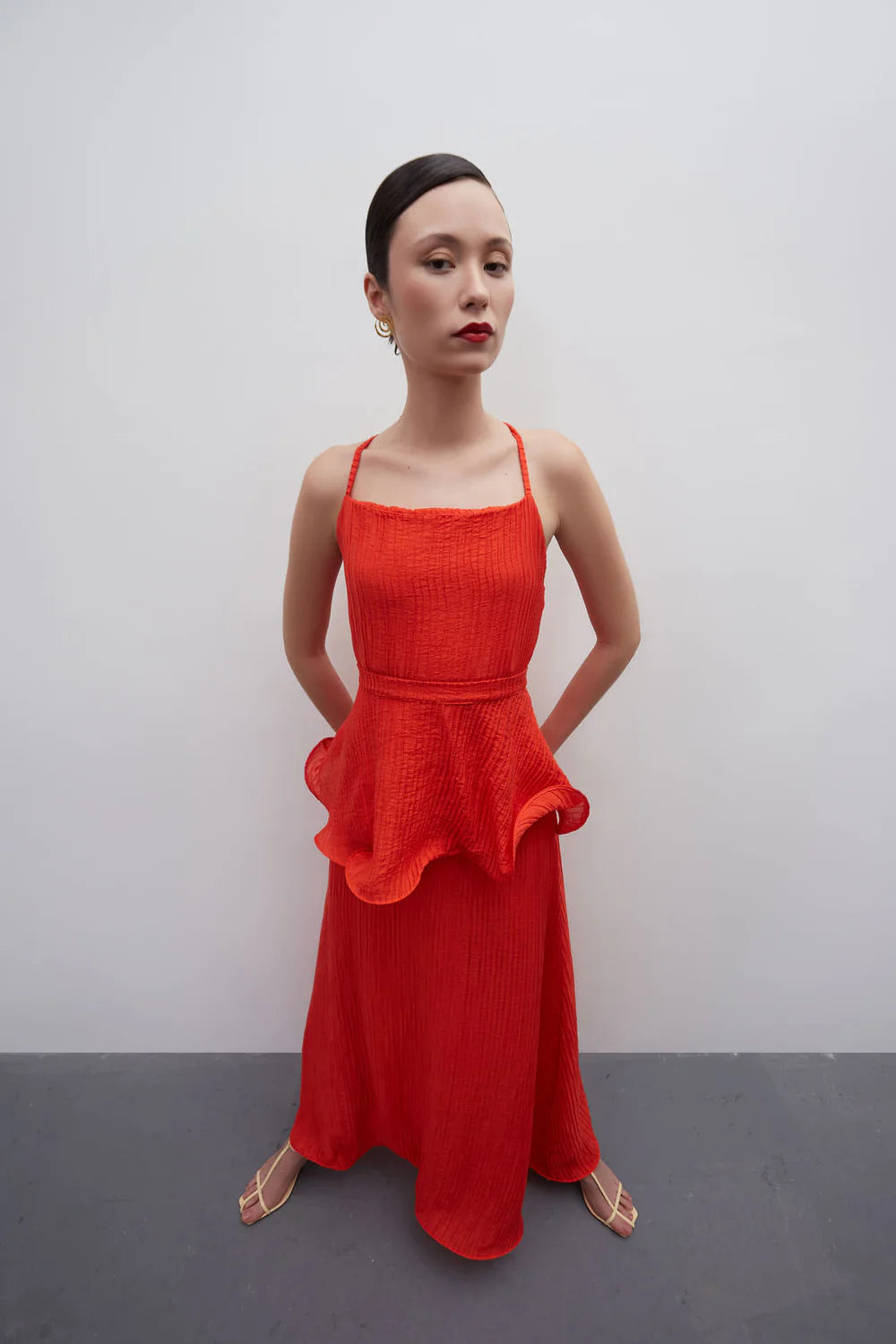 o detalhe extra fica por conta do peplum removível, que permite diferentes formas de uso: sozinho, para um visual limpo e contemporâneo, ou com o adorno, acrescentando volume e sofisticação. ideal para viagens, eventos diurnos ou produções de verão que pedem fluidez sem esforço. feito no brasil, em pequena escala e com autoria, reafirma moda autoral brasileira: design independente, produção local, tiragem limitada e impacto social.