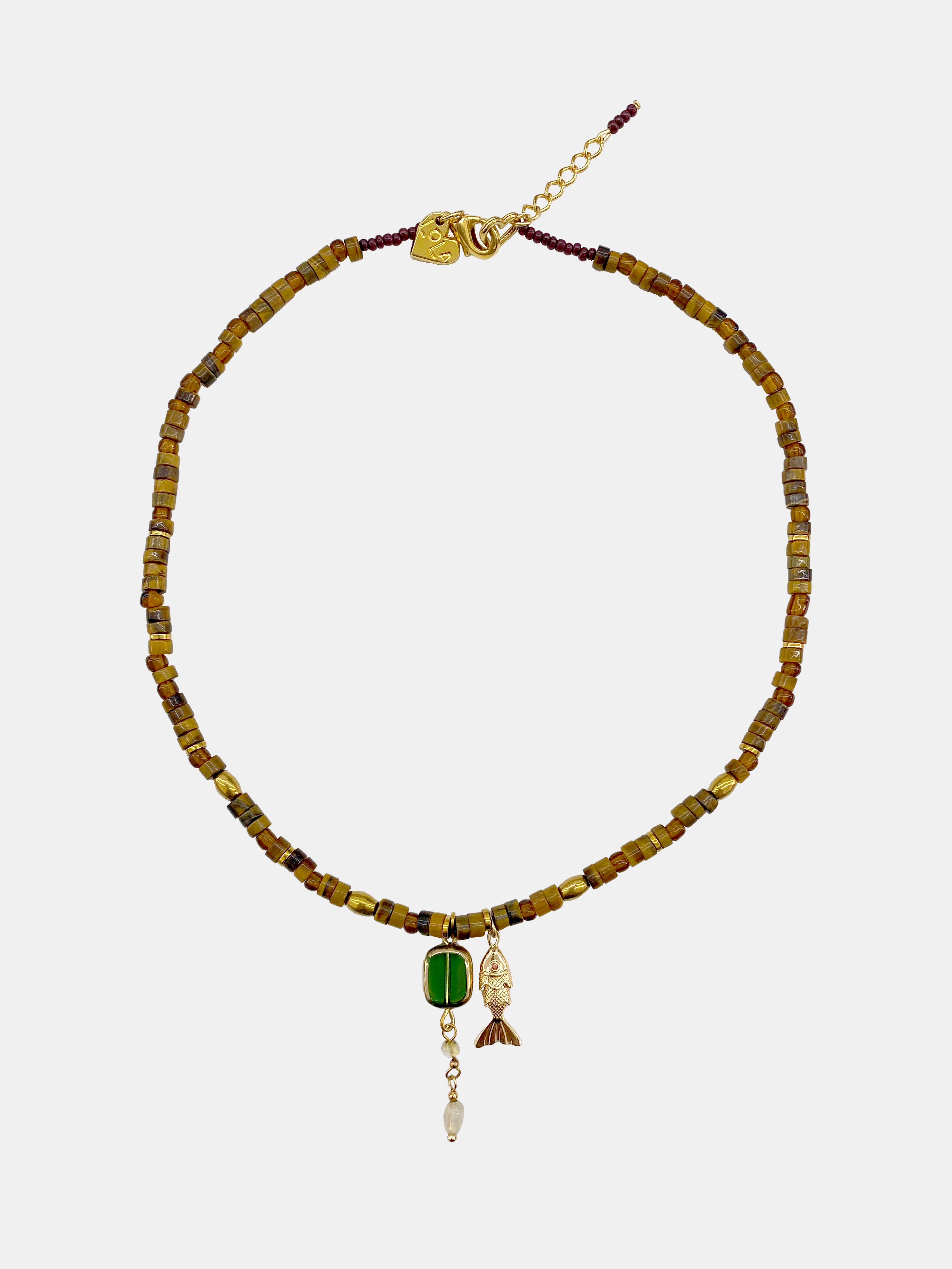 Colar de pedras disco em tons terroso, entremeios dourados e pingentes pedra verde e peixe articulado