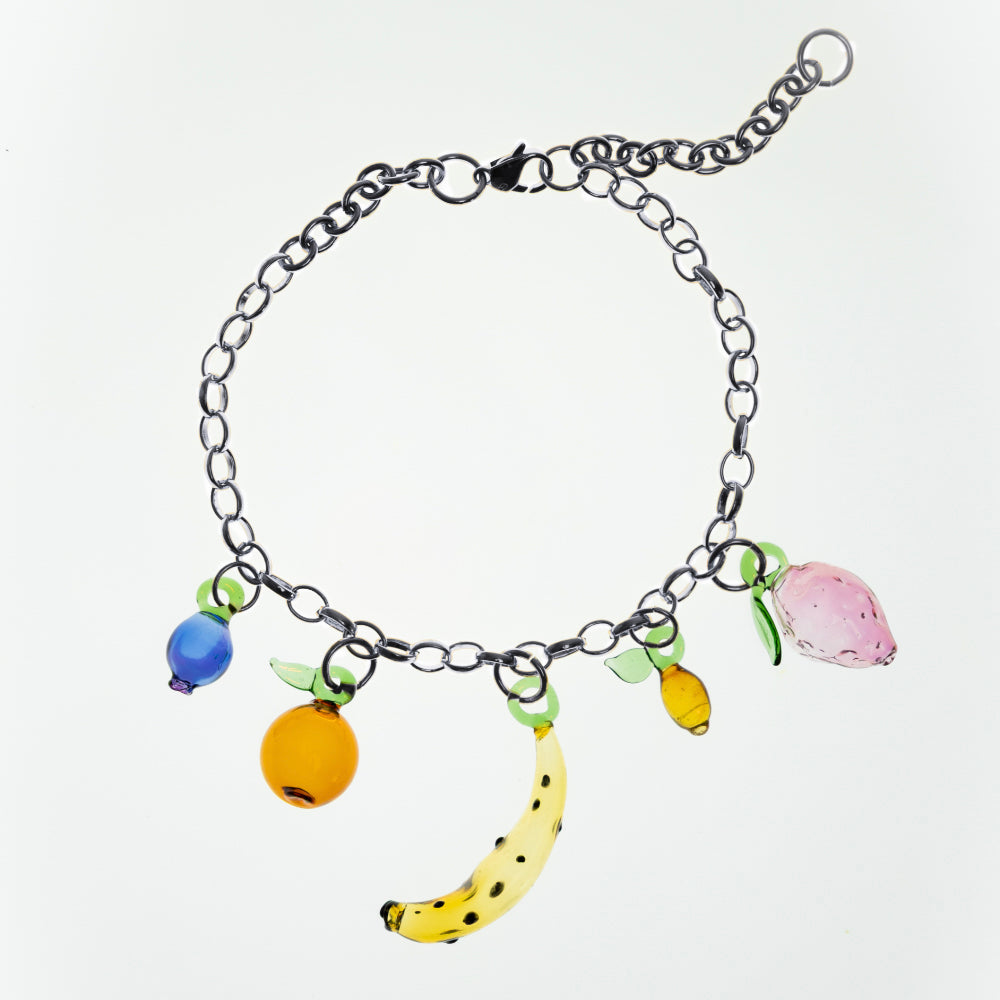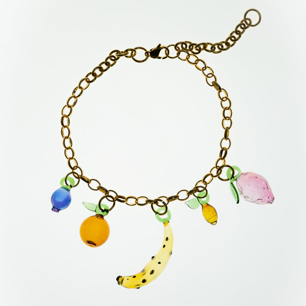 colar sopro de fruta, da ada love, é — feito à mão em vidro borossilicato soprado, com pingentes em formato de frutas modeladas artesanalmente, cada uma com nuances únicas de cor e textura. caju, morango, banana, mirtilo, abacaxi, laranja, pêra ou maçã podem aparecer na sua seleção — que é enviada de forma aleatória, mas também pode ser personalizada sob pedido. a corrente em metal com banho dourado traz contraste delicado, e há possibilidade de encomenda na versão prateada ou até em prata reciclada, reforçando o compromisso com práticas sustentáveis.