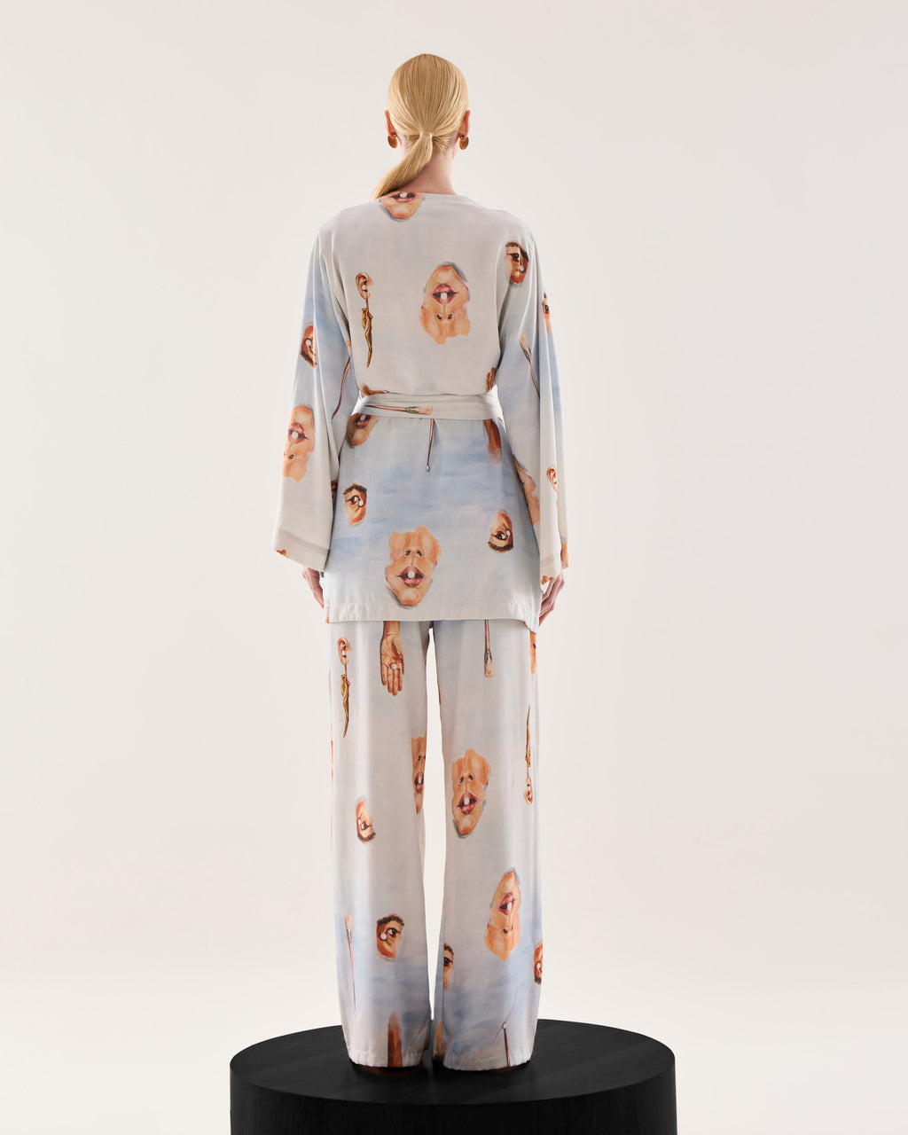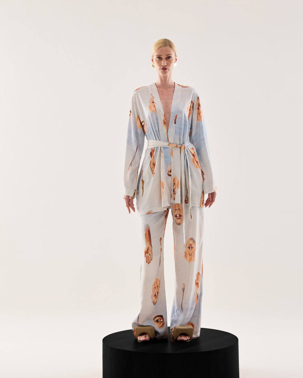 quimono traços, da sau, é confeccionado em viscose estampada, com modelagem ampla, mangas longas e faixa de amarração que permite diferentes ajustes de styling. o tecido leve e o corte solto criam movimento fluido, enquanto a estampa autoral garante presença gráfica e identidade própria.